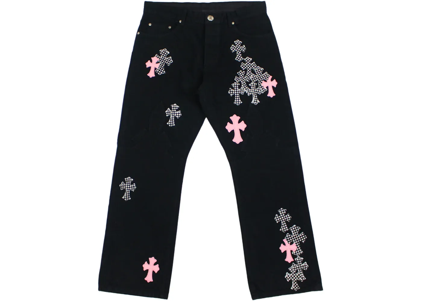 Chrome Hearts Pink & Checkered Cross Patch Fleurknee Jeans
